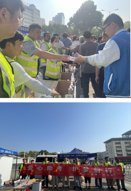 “中考加油”“旗開得勝!”青年志愿者正在為夏日炎炎下等待入場(chǎng)的中考考生送上助考物資和祝福。紫郡府項(xiàng)目部在淮北市中考考點(diǎn)設(shè)“愛心送考”服務(wù)臺(tái),為中考學(xué)子提供礦泉水、應(yīng)急文具用品等,提醒考生們檢查準(zhǔn)考證、身份證等考試必備用品。