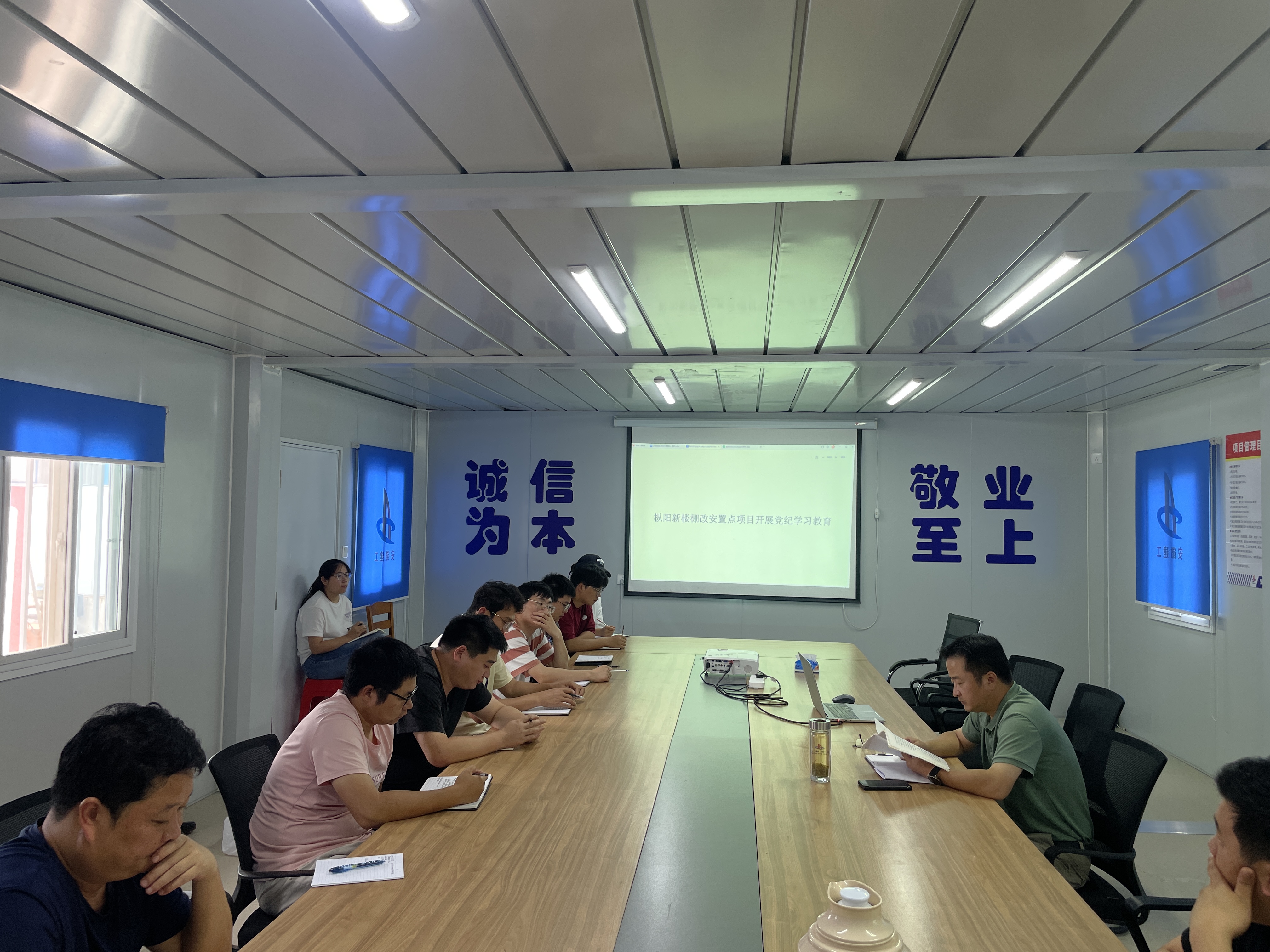 第三分公司副經理卜洪劍赴樅陽新樓棚改安置點項目。他結合《條例》、典型案例分析等內容進行黨紀教育,解讀了開展黨紀學習教育的目的要求、內容安排和重要意義,教育引導黨員干部學紀、知紀、明紀、守紀,自覺遵守和堅決維護黨紀黨規和公司規章制度。