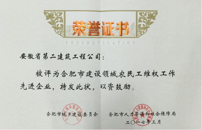 日前,在合肥市建委、合肥市人社局聯合舉辦的合肥市2016年度建設領域農民工維權先進管理單位、先進企業和先進個人的評比表彰活動中,安徽二建公司被合肥市建委授予“建設領域農民工維權工作先進企業”稱號。