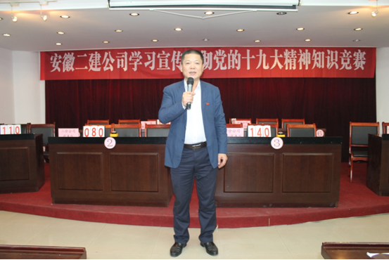 11月7日下午,安徽二建公司在原辦公樓三樓會議室舉辦了“學(xué)習(xí)宣傳貫徹黨的十九大精神知識競賽”活動。來自所屬各黨支部共計11支代表隊參加了此次比賽。公司黨委書記劉賢奇、總工程師邱立龍應(yīng)邀出席會議,工會主席李林、紀(jì)委書記仇多維、女工部主任王俊共同擔(dān)任本次知識競賽活動的評委。公司機關(guān)各部門負(fù)責(zé)人,黨群部門全體人員,分公司黨政主要負(fù)責(zé)人、團支部書記觀看比賽。