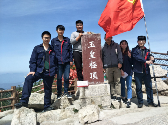登山小隊在團旗的引領下,從堯山腳下向玉皇山頂進發。登山途中,大家一邊欣賞美麗的風景,盡情享受新鮮的空氣和明媚的陽光,一邊聊天,暢談著戶外活動的愉悅感受。經過近兩個小時的奮進,在不斷的互相勉勵、加油鼓勁下,登上了峰頂,并合影留住這美好的瞬間。