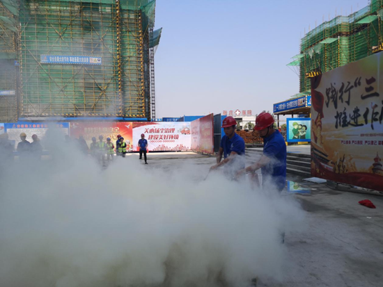 啟動儀式上,一分公司副經理崔俊對本次安全生產月活動主題、活動主要內容進行了宣貫,并對后期安全生產工作進行安排部署,隨后在安全負責人的帶領下莊嚴宣誓,并有序地在宣誓標語橫幅上簽名。項目人員還觀摩學習了滅火器的正確使用方法以及對因高空墜物受傷人員的緊急處理演示。