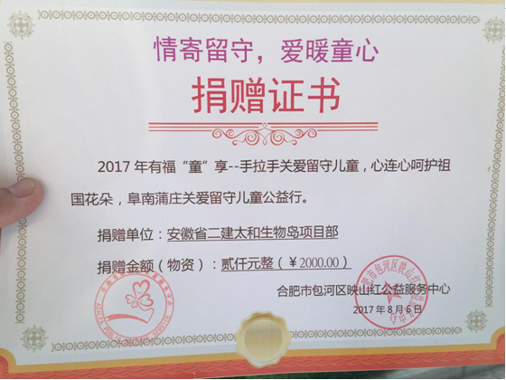 安徽二建太和生物島項目部參與開展關愛“留守兒童”捐助活動